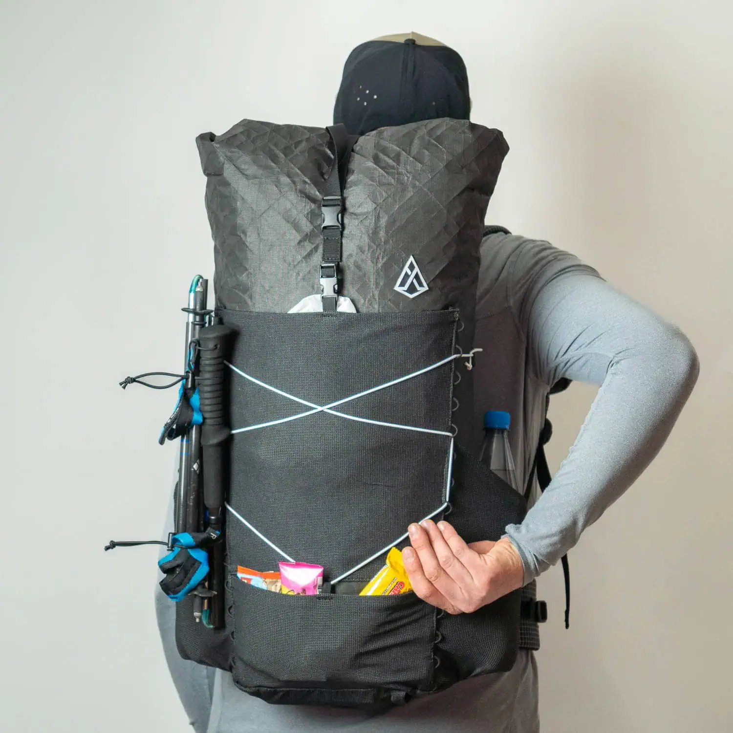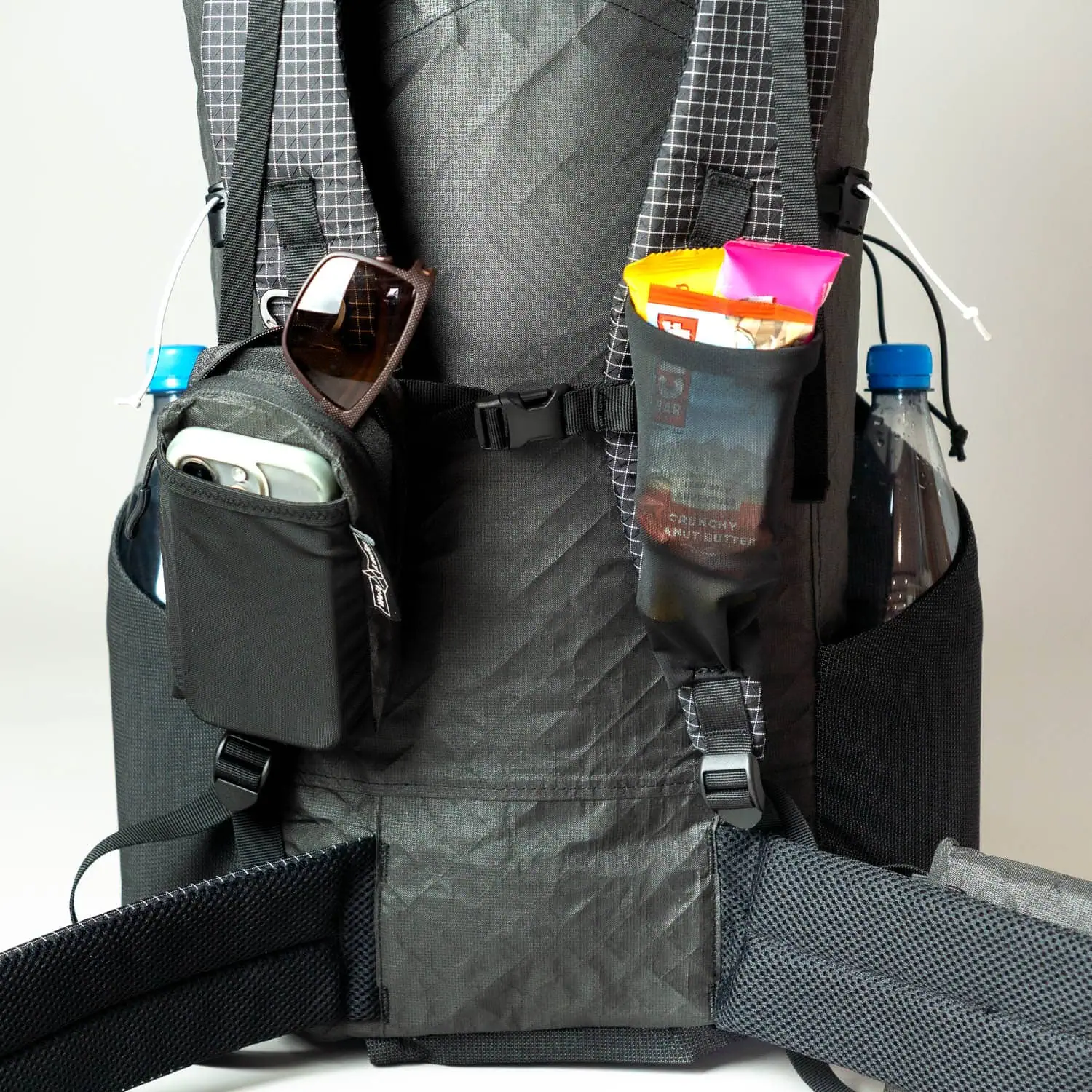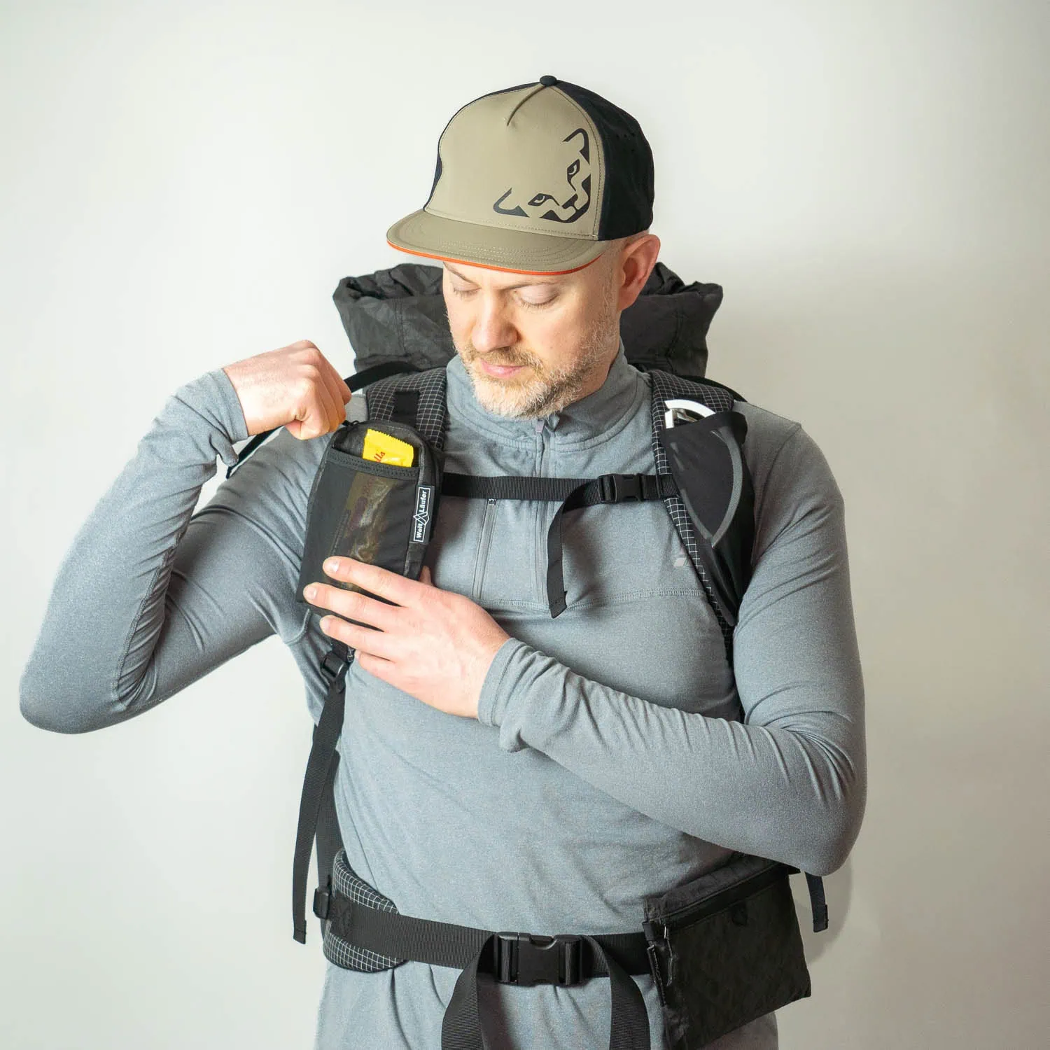 Für schnellen Zugriff ohne Absetzen sorgen drei spezialisierte Taschen: Die elastische Bodentasche ist bequem mit der rechten Hand erreichbar (ideal für Snacks) und besitzt links eine separate Öffnung für Müll (Snackverpackungen). Die bewährte Quick-Reach Eingrifftasche unter der Fronttasche (gesichert per Kordelzug) bietet Platz für Stirnlampe, Wasserfilter, Sonnenbrille oder Handschuhe. Ergänzt wird dies durch eine Schultergurttasche aus 4-Wege-Stretch über der linken Schulter für Smartphone, Snacks oder eine 0,5-Liter-Flasche (optional ist eine Reißverschlusstasche für rechts erhältlich).54 Liter Volumen & Organisation